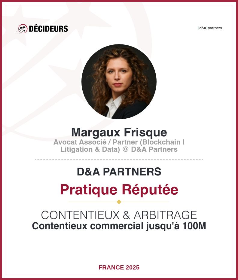Avocate depuis près de 10 ans, Margaux Frisque est associée fondatrice du cabinet d&a partners. Elle intervient en droit des affaires (conseil et contentieux).